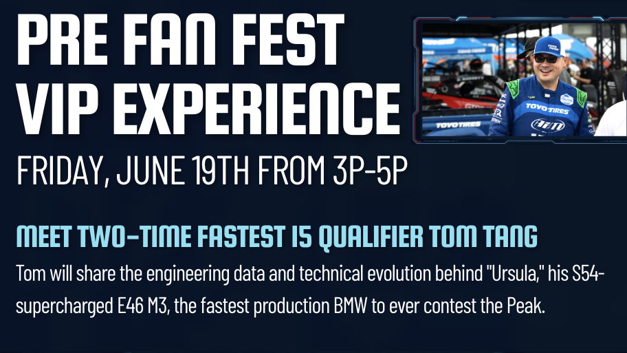 This private engagement is anchored by a featured briefing at 4:00 PM with two-time Fastest 15 Qualifier Tom Tang. Tom will share the engineering data and technical evolution behind "Ursula," his S54-supercharged E46 M3, the fastest production BMW to ever contest the Peak.